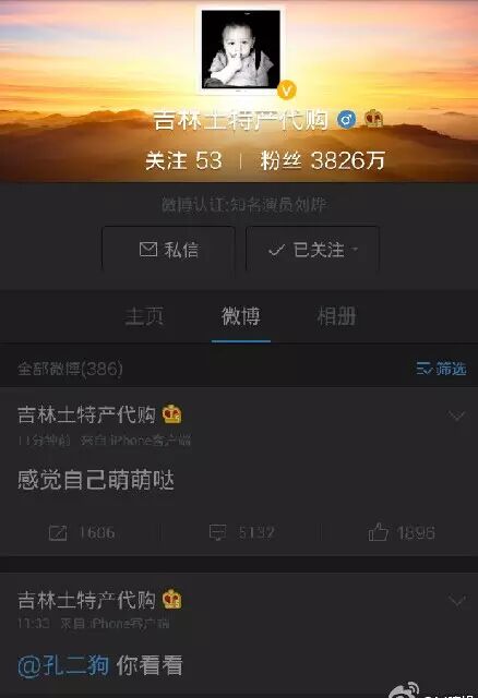 现在旧事重提,刘烨为了维护吉林一枝花的形象,将名字改成“吉林土特产代购”。这个微博名同时也被再次刷上了热门,网友纷纷调侃社长真是蠢萌蠢萌的!