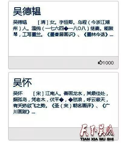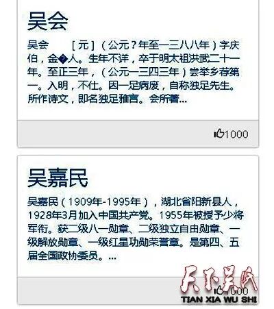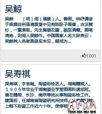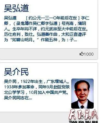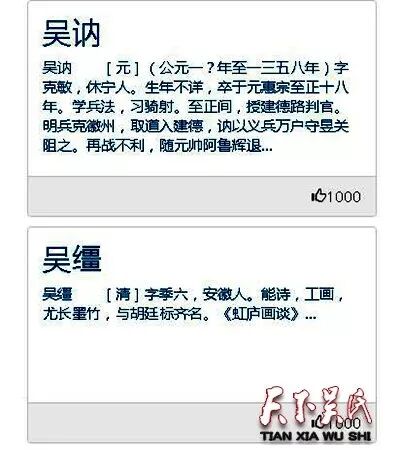 吴道子,唐代著名画家。被后人奉为"画圣"。其画线条遒劲雄放,变化丰富,一变古来沿袭的高古游丝描的细笔,发展了线描的艺术方法,故表现出来的物象富有运动感、节奏感,被人们称为"吴带当风"。吴承恩,明朝小说家。著有《西游记》传世。吴勉,贵州黎平侗族英雄。吴起,战国时著名军事家。卫国人。初为鲁将,继为魏将,后奔楚国,任令尹,主持变法,后被杀。吴广,秦末农民起义领袖。公元前209年与陈胜发动戍卒九百人起义,建立张楚政权。后为部将田臧假借陈胜命令杀害。吴敬梓,清代人,以小说《儒林外史》而著称的杰出讽刺作家。吴沃尧,清代著名小说家。著有《二十年目睹之怪现状》。吴昌硕,清代著名的篆刻家、书画家。工诗,善书法,尤精篆刻。吴其濬,清代著名政治家、科学家。著有被誉为19世纪中国重要的植物学著作《植物名实图考长编》22卷和《植物名实图考》38卷。
