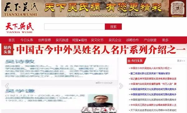 《天下吴氏》网 由中国报道魅力城乡主编吴蜀丰创办,是中英文域名合法注册的网站,坚持以传承吴文化为己任,弘扬至德精神为宗旨,在吴氏宗亲组织中坚持不站队,以传递正能量为主旋律,坚持正确﹑客观﹑公正的舆论导向。《天下吴氏》网 及W信公众号是吴氏宗亲宣传﹑展示分享交流的新媒体平台。每天有近万名读者关注,《天下吴氏》网设有以下栏目《今日头条》 《世界至德》《中华吴氏》《吴氏文化》《吴氏资讯》《吴氏族谱》 《祠堂●福地》《吴氏企业》《战略合作》《产业联盟》《吴氏原创》《吴氏名人》《吴氏书画》《百家姓氏》《关于我们》。