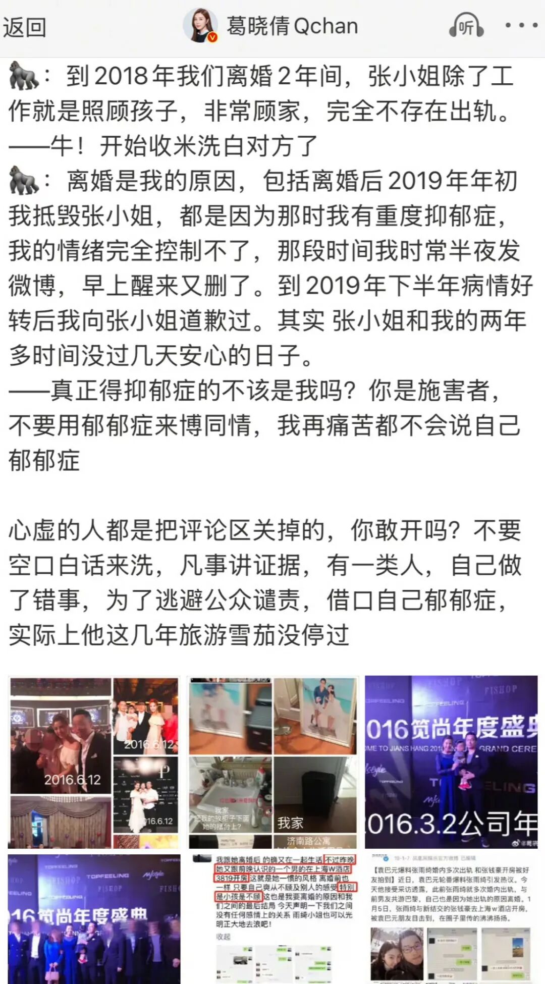 袁巴原今天出来发长文否认张雨其(名字故意写错)是小三,内容比较多,简单来说就是袁巴原先跟葛晓茜有分手协议,然后再跟张雨其在一起的,还说自己跟葛在一起的时候有重度抑郁。没多久就被葛打脸,晒图证明恋情时间线有重合,说是有抑郁症,实际旅游雪茄没停过。圈圈最烦动不动就拿抑郁症当借口的,别污化了这个疾病,要是真有重度抑郁症,以张雨其那个精明劲,还能看上你?当时俩人闹的都要刀子去警局了,各种撕,为了给孩子改名还去男方公司大闹一场,这怎么整的跟一家子一样团结。有没有当小三看实锤就行,等等别再把余男逼出来再爆料就搞笑了。她的感情观本来就挺奇葩的,她和人看对眼就在一起,不管对方是什么状况,只要她爱上了就是真爱,男方有没有老婆有没有女友,是不是需要先离婚先分手再在一起,都不在她的考虑范围之内,她自己也不在乎,关她什么事呢,这是你们应该要考虑的问题,一个管不住自己,一个管不住自己的男人。这么硬核的感情观支撑她过了很多年,所以每段感情都是快刀斩乱麻,过去的感情她压根都不会留恋,这次这么费劲吧啦的找前夫澄清也是因为怕影响自己赚钱,前夫很久没给抚养费,有把柄在自己手里,只能拼命给自己洗白了。现在对张雨其来说最重要的就是赚钱,谁都不能影响她赚钱。