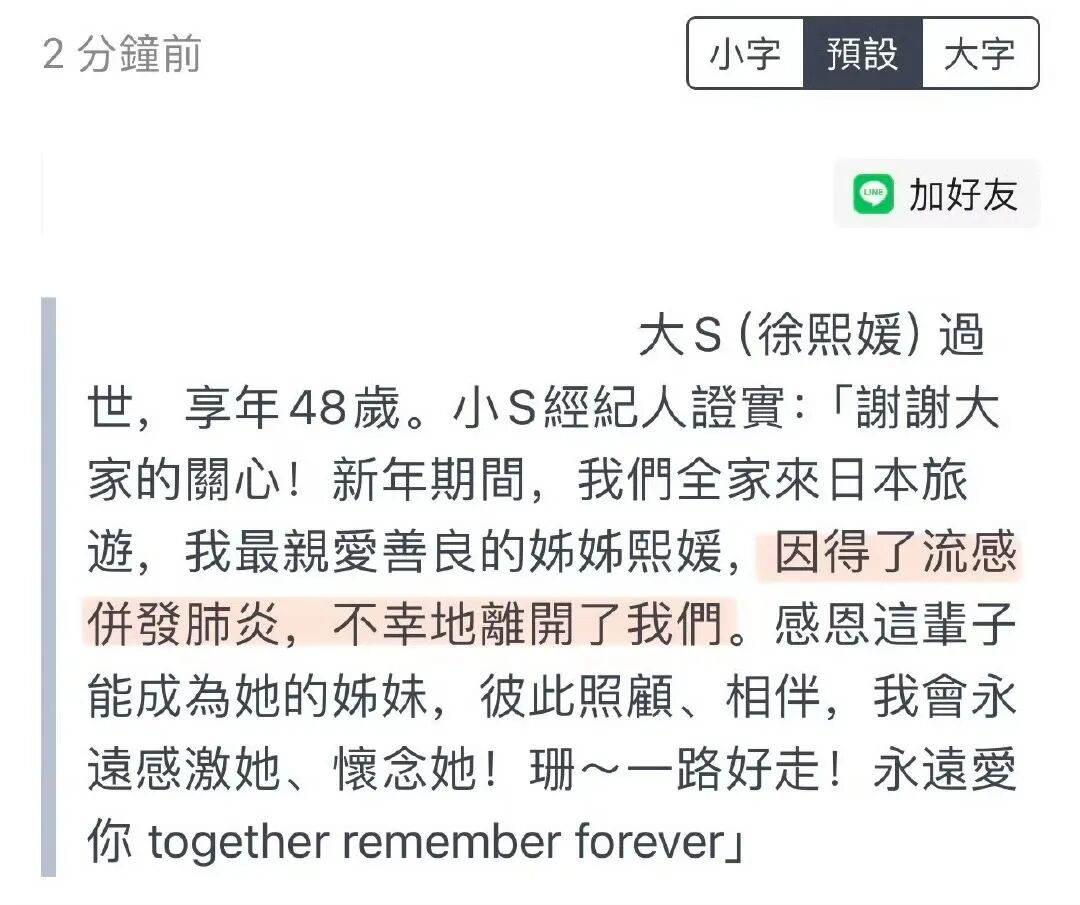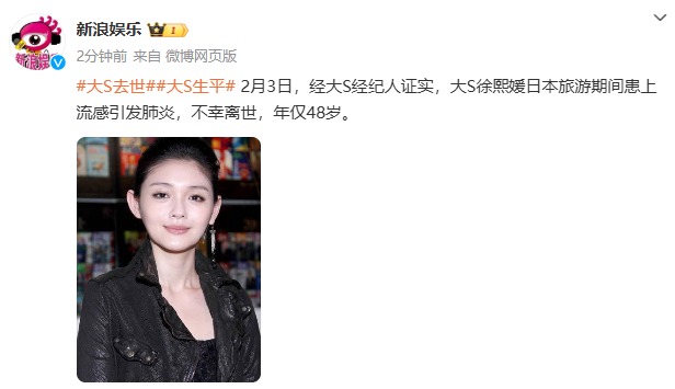 据新浪娱乐,2月3日,经大S经纪人证实,大S徐熙媛日本旅游期间患上流感引发肺炎,不幸离世,年仅48岁。