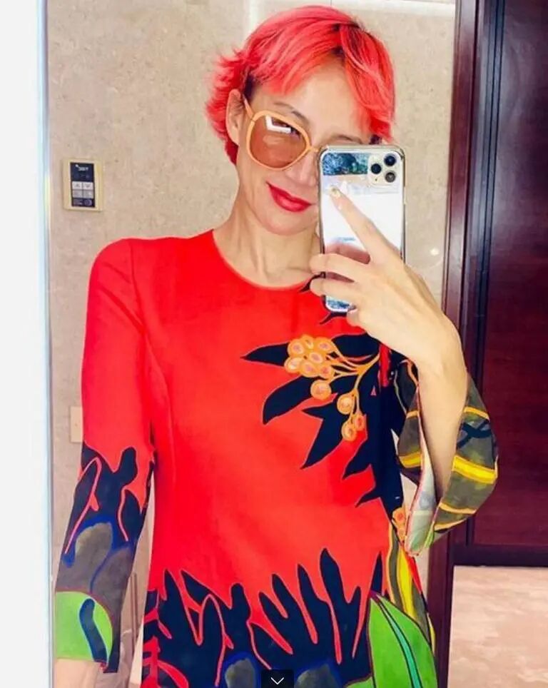 但是有的时候她整个人的造型可能很多人都是无法理解的,就像这个时候头发的颜色变成了红色,这种颜色确实不是特别好看。再加上这个时候她上半身穿的这件衣服也是这种颜色的,看起来就像是一个大妈。
