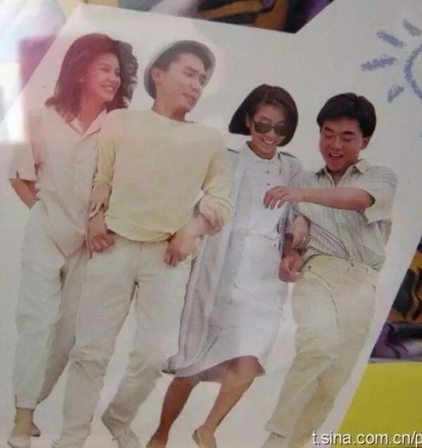 当年曾华倩还在与梁朝伟热恋之中。照片她挽着伟仔的手,和梅艳芳、吕方等人拍摄照片。