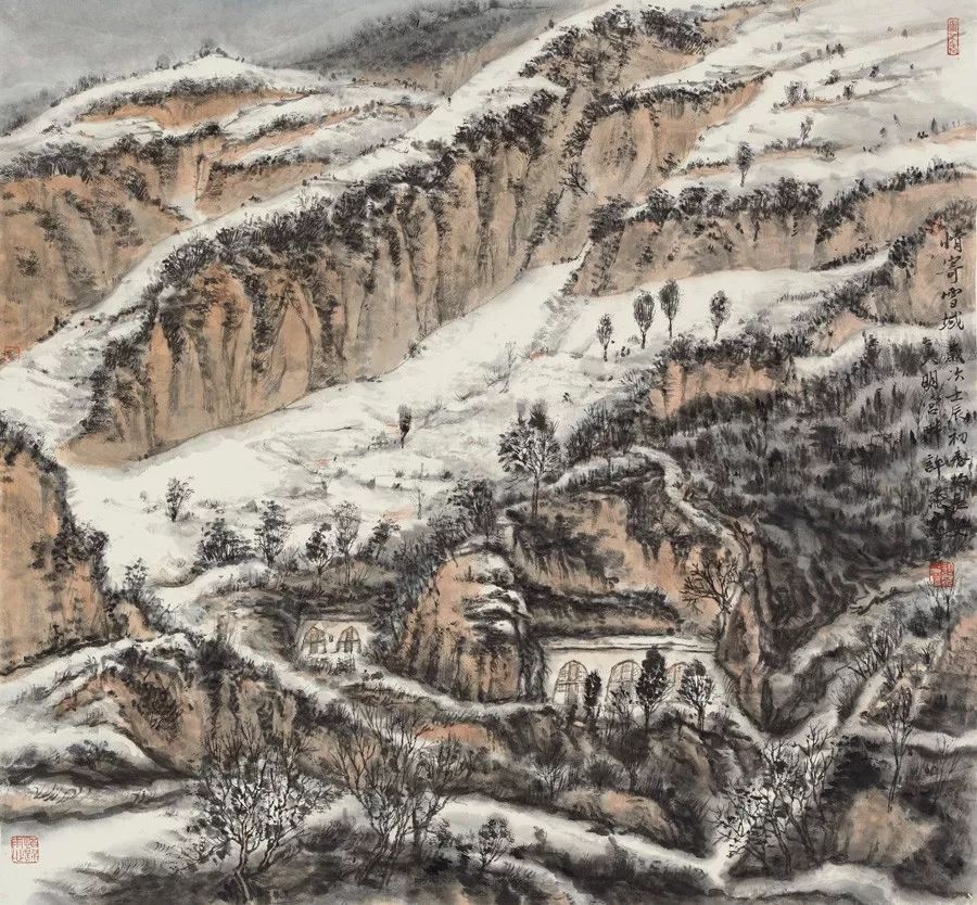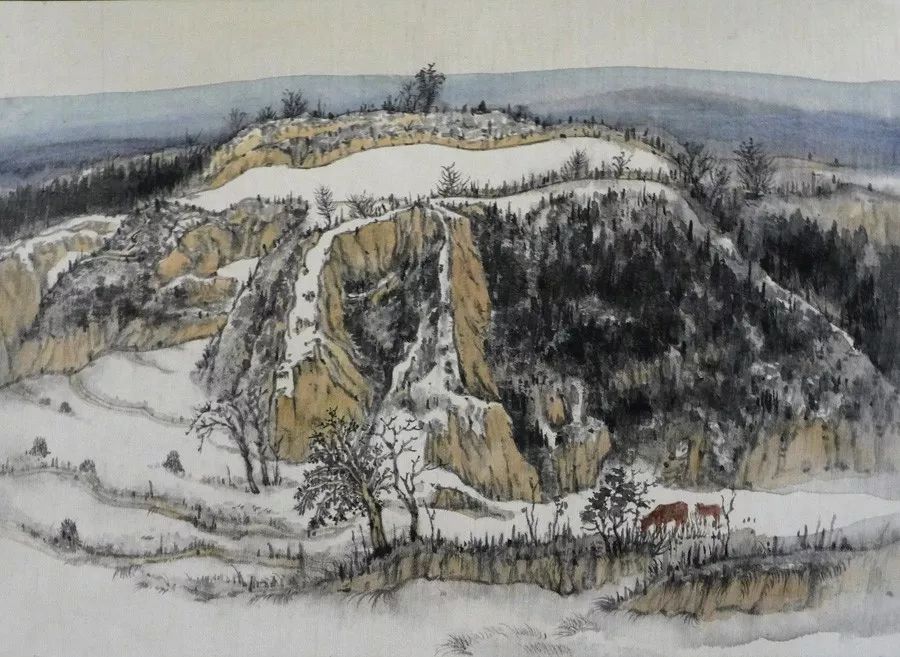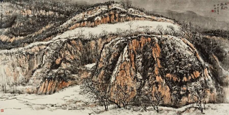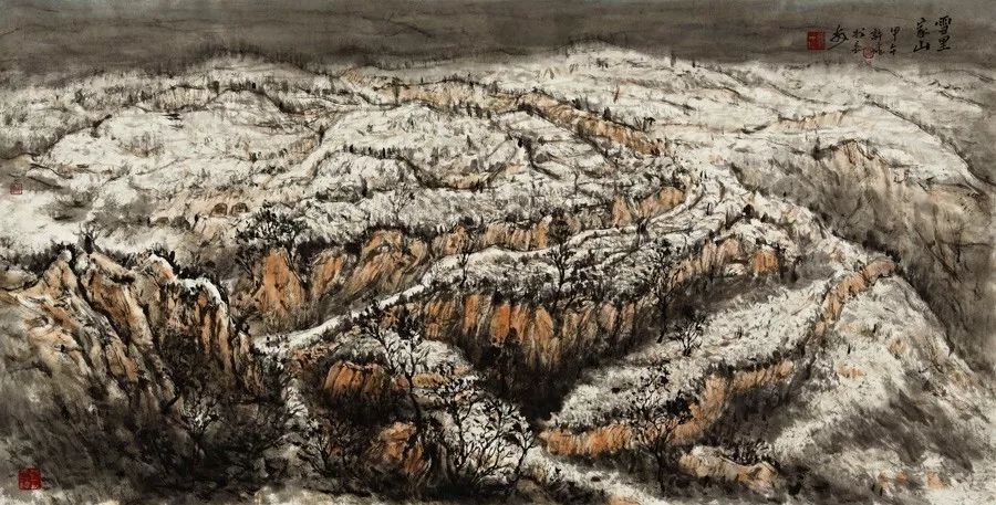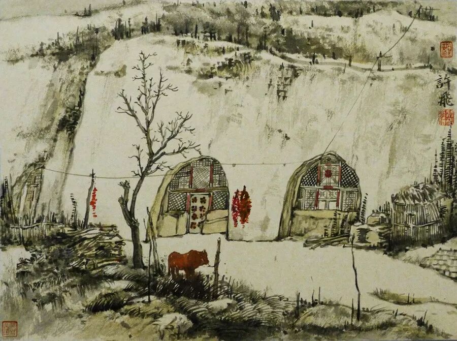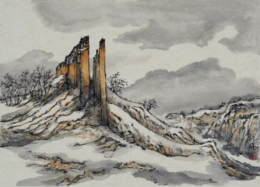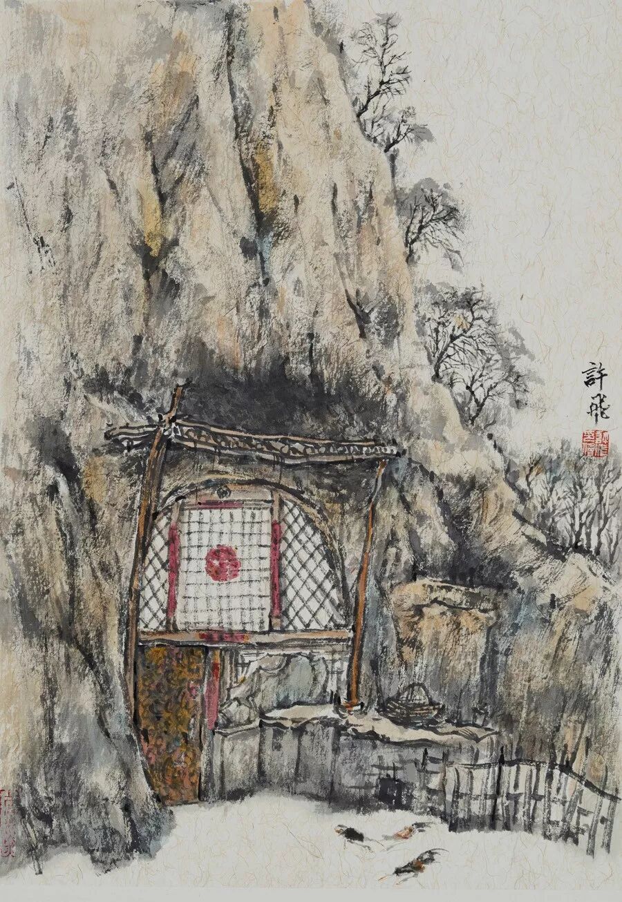 画如其人其风,作品浑厚深沉,没有一丝“初出茅庐”的稚气之感。遂意识到他创作的起点很高,能想象到他苦心求学、精心教学的艰辛和研习博学的样儿。何以有此想象?是从他多幅山水画“古风古韵”的画风引起的。虽也是画黄土高原,画寒山雪景,但却明显留有中国历代山水画古风古韵的承传基因。可能与我酷爱中国古代诗词有关,便引起了我随口吟诵古韵歌曲的欲望,觉其画作,可歌可唱,是充满隋唐古乐情调的。《雪境皓然》的“原驰蜡象”,“枯树翘枝”,“窑洞叠影”,“土坡如注”,给人辽阔、透远的感觉;《雪原》《雪韵》的“银装素裹”,“群木凋零”,会使你肃立于“宁静气息”之中,发出无限的幽思与感慨。如同涂有陕北“塞外”色彩的《菩萨蛮》《关山月》和《雨霖铃》一般,会让你驻足不前,和曲吟唱的。这就是我阅读许飞的直感。