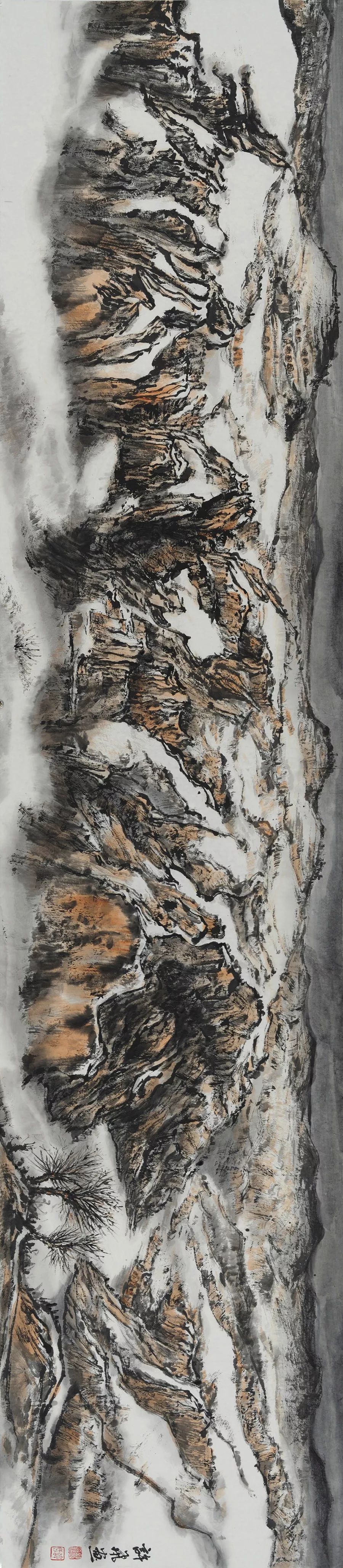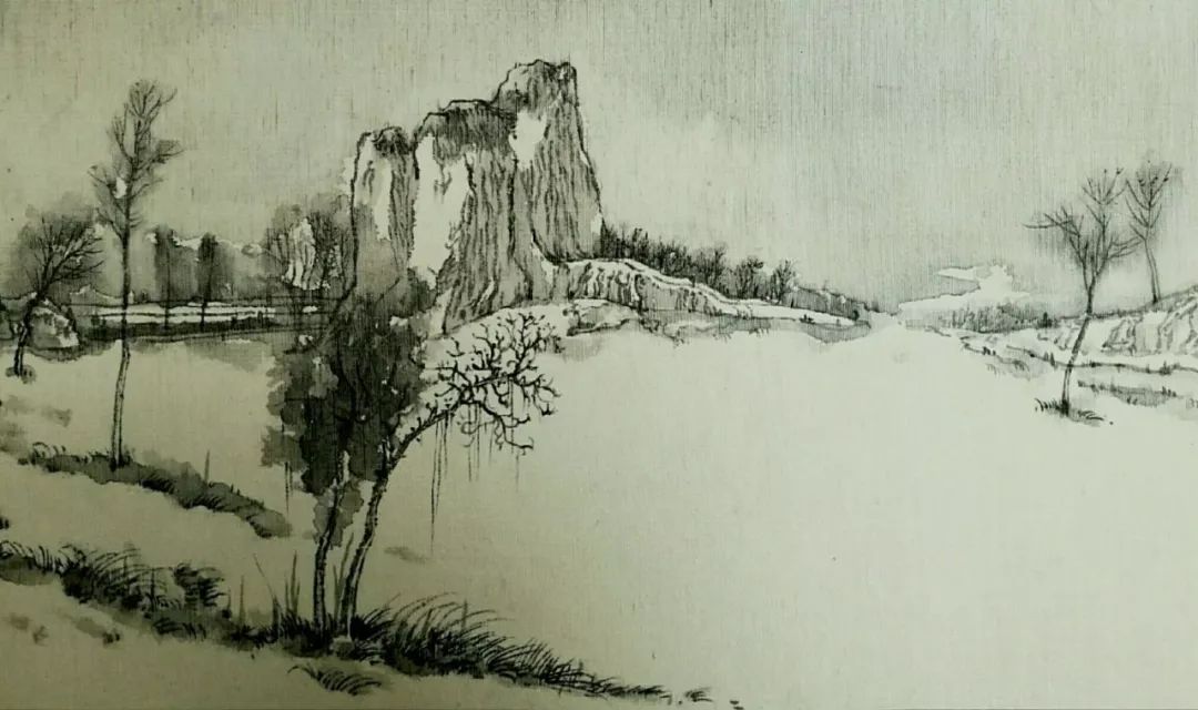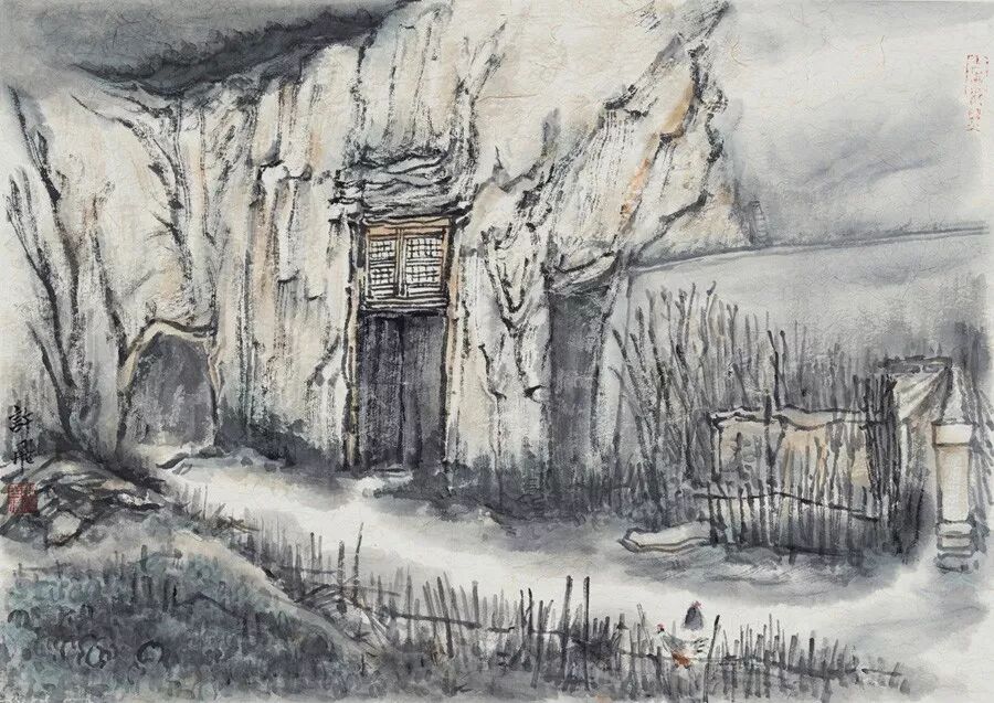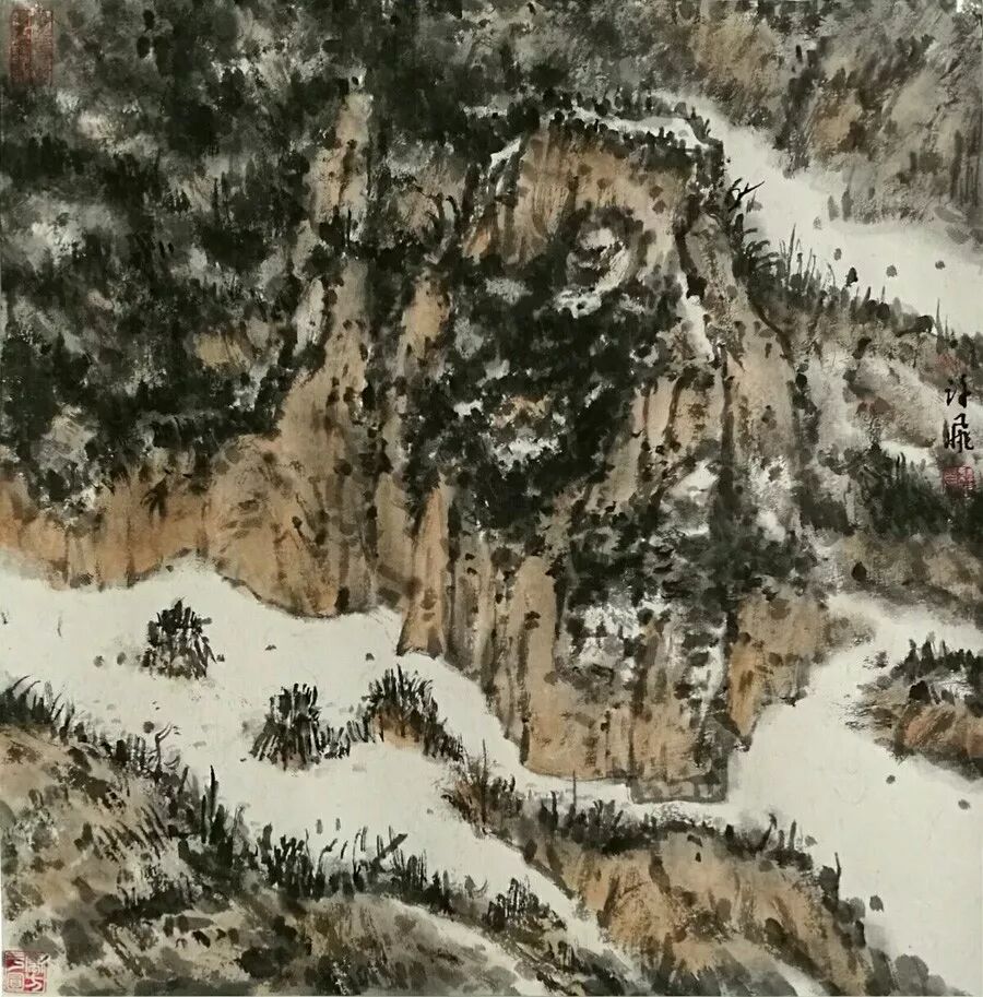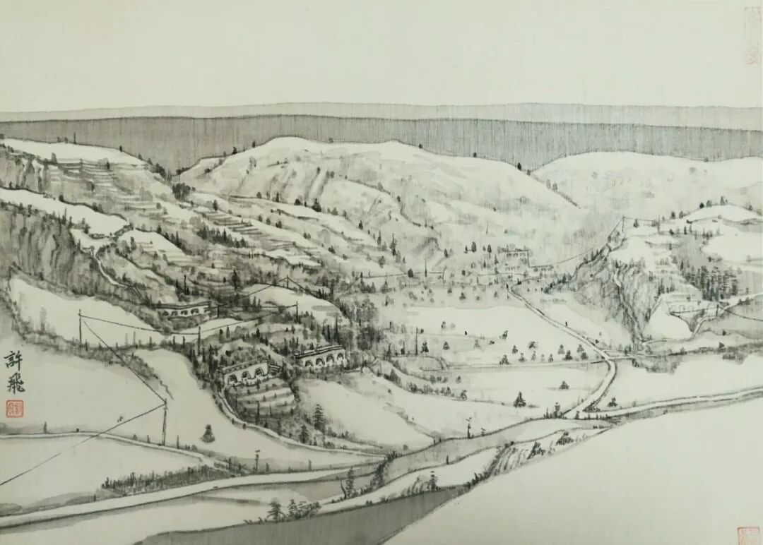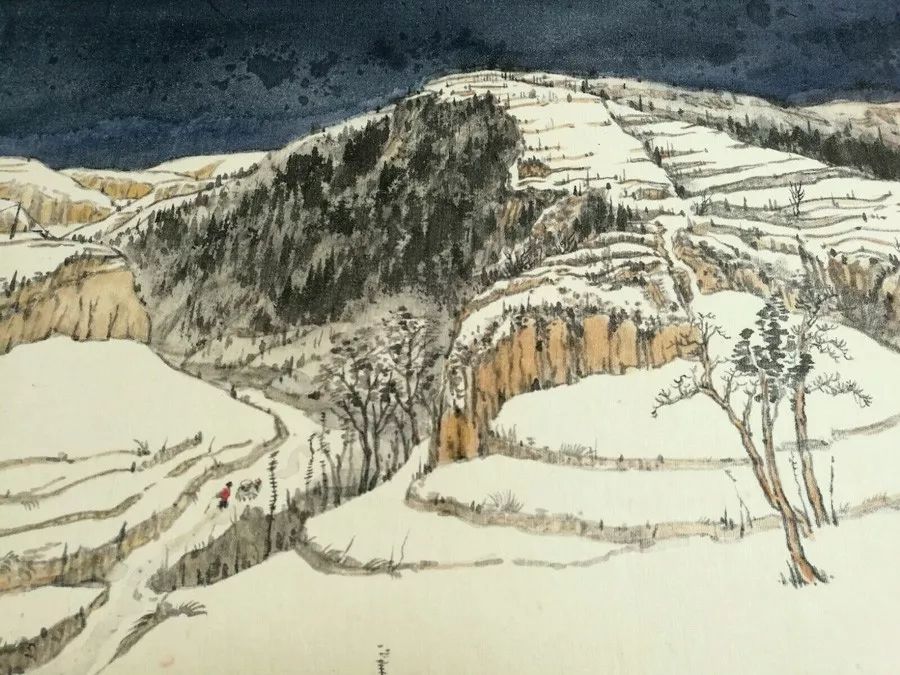 画如其人其风,作品浑厚深沉,没有一丝“初出茅庐”的稚气之感。遂意识到他创作的起点很高,能想象到他苦心求学、精心教学的艰辛和研习博学的样儿。何以有此想象?是从他多幅山水画“古风古韵”的画风引起的。虽也是画黄土高原,画寒山雪景,但却明显留有中国历代山水画古风古韵的承传基因。可能与我酷爱中国古代诗词有关,便引起了我随口吟诵古韵歌曲的欲望,觉其画作,可歌可唱,是充满隋唐古乐情调的。《雪境皓然》的“原驰蜡象”,“枯树翘枝”,“窑洞叠影”,“土坡如注”,给人辽阔、透远的感觉;《雪原》《雪韵》的“银装素裹”,“群木凋零”,会使你肃立于“宁静气息”之中,发出无限的幽思与感慨。如同涂有陕北“塞外”色彩的《菩萨蛮》《关山月》和《雨霖铃》一般,会让你驻足不前,和曲吟唱的。这就是我阅读许飞的直感。