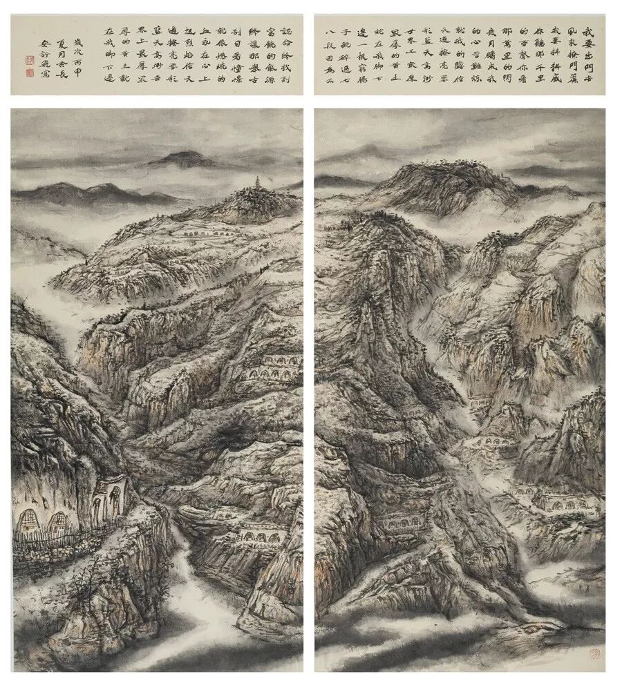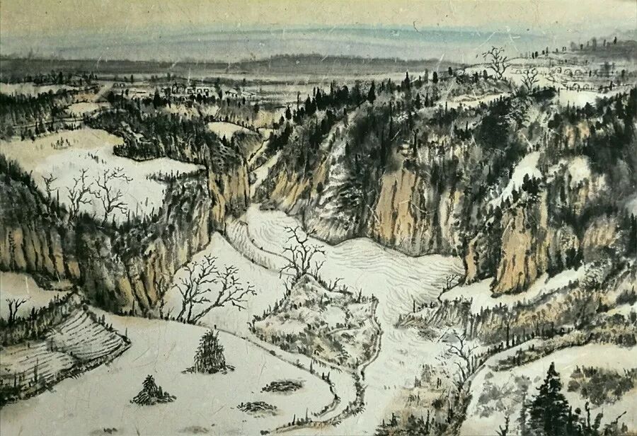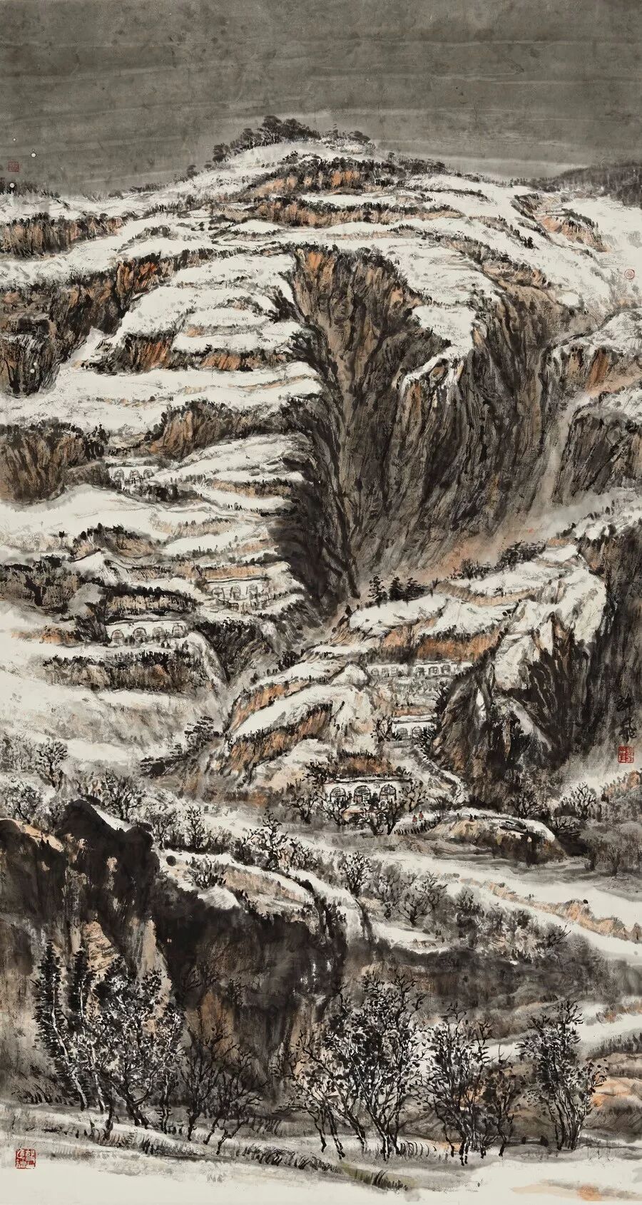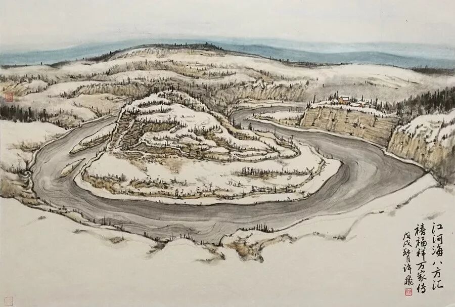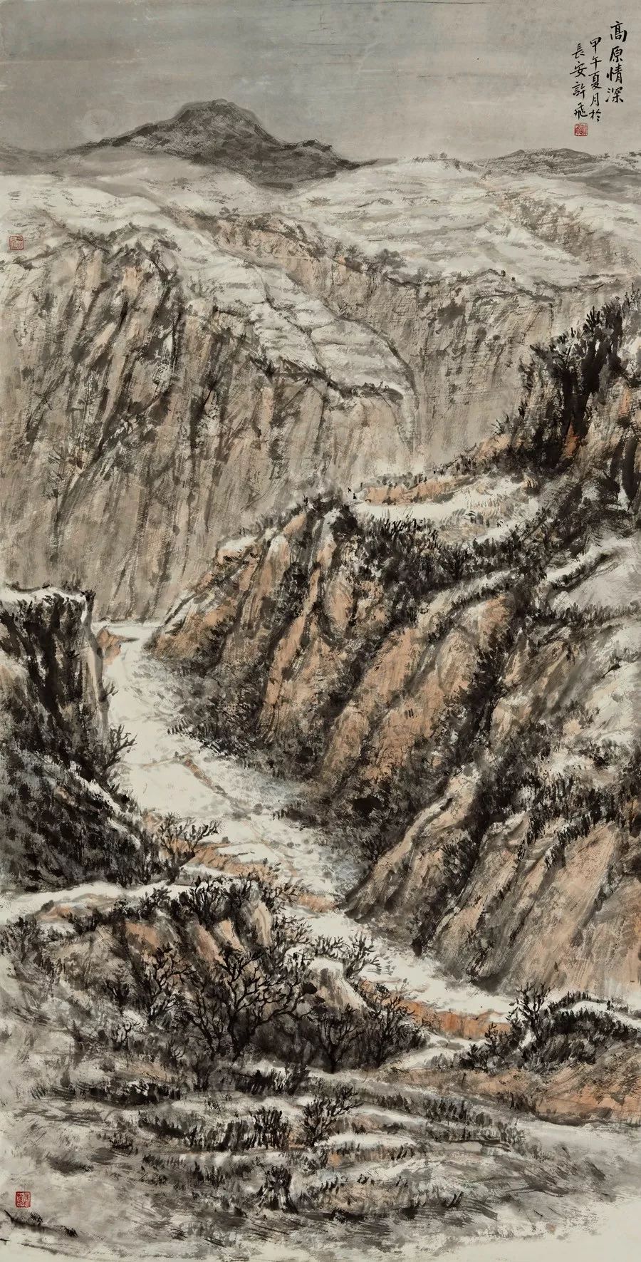 画如其人其风,作品浑厚深沉,没有一丝“初出茅庐”的稚气之感。遂意识到他创作的起点很高,能想象到他苦心求学、精心教学的艰辛和研习博学的样儿。何以有此想象?是从他多幅山水画“古风古韵”的画风引起的。虽也是画黄土高原,画寒山雪景,但却明显留有中国历代山水画古风古韵的承传基因。可能与我酷爱中国古代诗词有关,便引起了我随口吟诵古韵歌曲的欲望,觉其画作,可歌可唱,是充满隋唐古乐情调的。《雪境皓然》的“原驰蜡象”,“枯树翘枝”,“窑洞叠影”,“土坡如注”,给人辽阔、透远的感觉;《雪原》《雪韵》的“银装素裹”,“群木凋零”,会使你肃立于“宁静气息”之中,发出无限的幽思与感慨。如同涂有陕北“塞外”色彩的《菩萨蛮》《关山月》和《雨霖铃》一般,会让你驻足不前,和曲吟唱的。这就是我阅读许飞的直感。