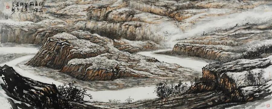 其山水画多为黄、黑、白三色的配搭,其色调给人以厚重、淳朴、苍凉、深沉的感觉。一幅山水画,就像一首浑厚雄壮的交响乐,如西安鼓乐中的《雁落沙滩》,似贝多芬笔下的《悲怆》。这自然是来自他对家乡深邃的理解和感受。