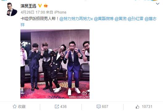 昨天半夜,《极限挑战》男人帮的成员就在微博晒了,一起看看。