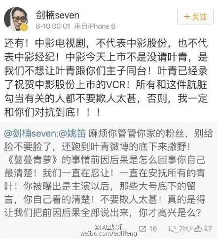 今天,疑似叶青经纪人的剑楠直接@姚笛,进行怒斥。基本证实了抢角色的骂战导火线。