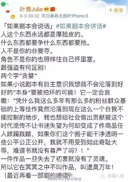 如果这件事真的只涉及抢角色,那么女星叶青的意思莫非是她来演就是上等佳作,别人抢了她的角色,这部电视剧就成了遗臭万年,小妹先不站队,但是不懂这个逻辑…