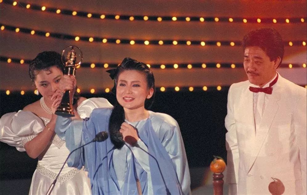 ▲ 1991年的十大劲歌金曲颁奖礼出现罕见的“双黄蛋”,陈淑桦的《梦醒时分》和林忆莲的《爱上一个不回家的人》并列最佳国语歌曲金奖,为二位颁奖的是老牌天后潘迪华。图为陈淑桦在颁奖礼表演。