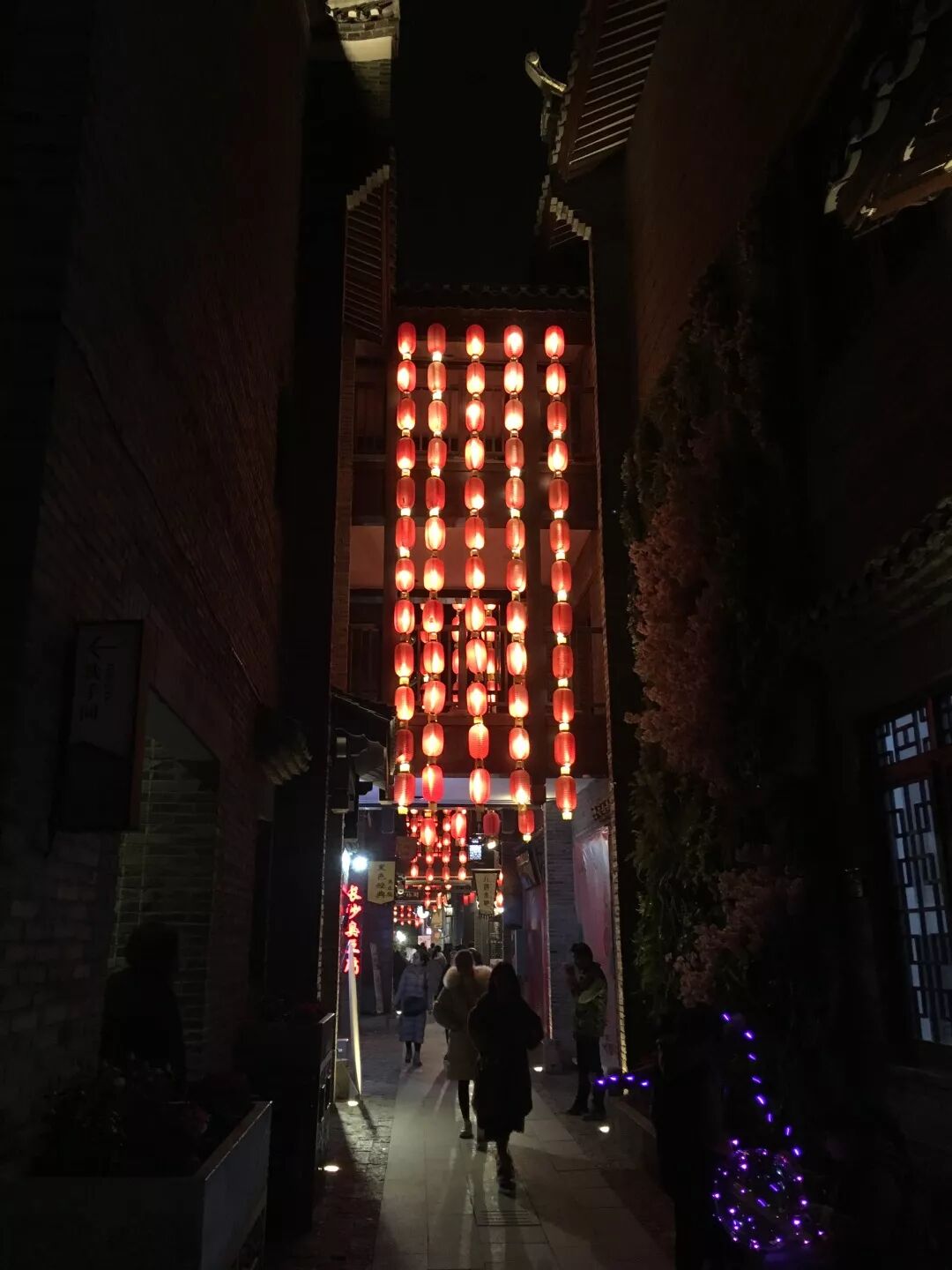 树上挂着闪灯,还有很多的小吃饰品服装店,很显眼的是超级大的古风星巴克,南京都没有这么大的星巴克。
