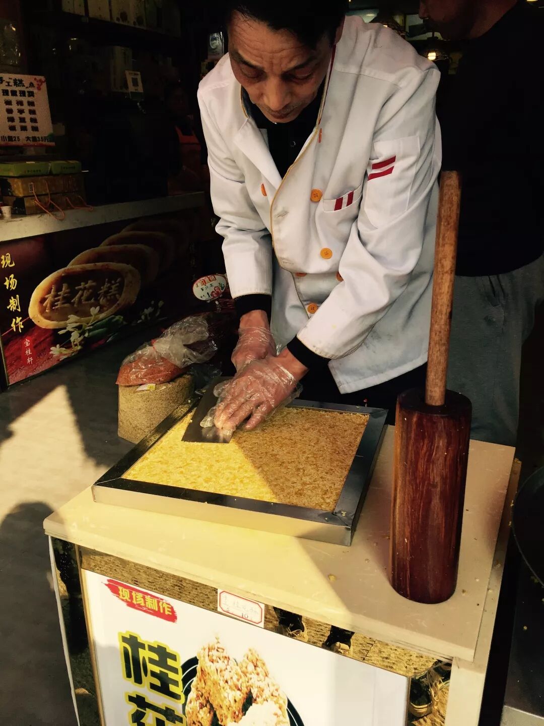还可以在这里买土特产,看老爷爷手作桂花糕很香的样子。