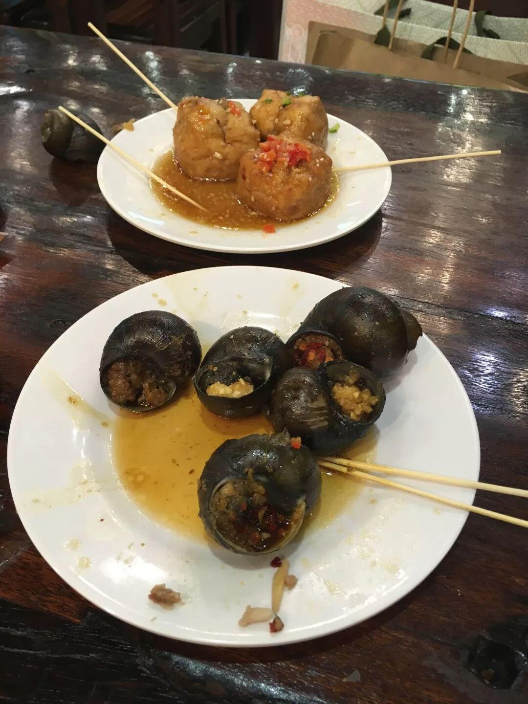 我们尝了桂林十八酿中的田螺酿和豆腐酿,总感觉臭臭的很难吃。