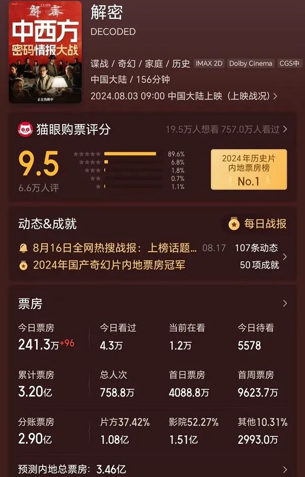 可惜的是,《解密》不是中国的《奥本海默》。豆瓣评分一降再降到了6.4分。上映16天票房3.2亿元,日排片只剩1.5%,猫眼专业版给它的预测票房也一降再降,降到不足3.5亿元,最终投资方约1.2亿元,可能覆盖不了制作、宣发成本,面临亏损。