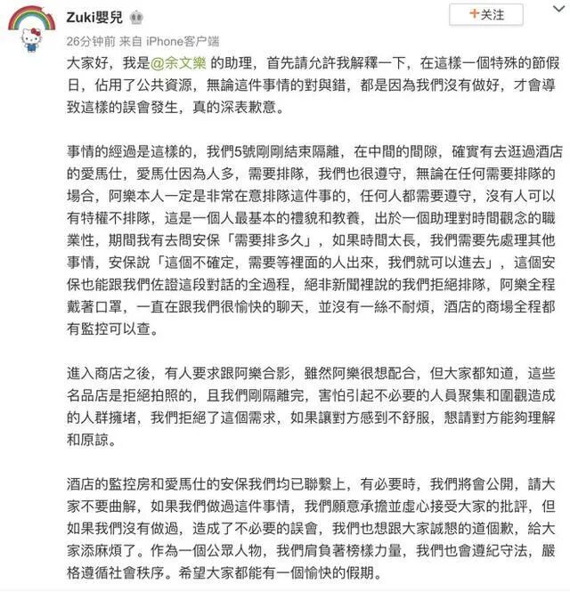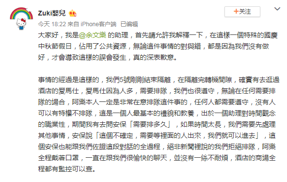 于是余文乐的助理再次编辑贴文:“在这样一个特殊的国庆中秋节假日里,占用了公共资源。”