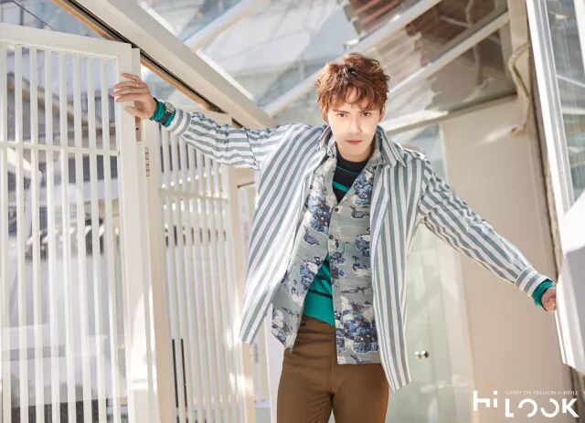 徐正溪身着LANVIN条纹T恤和印花短袖衬衫出镜杂志拍摄