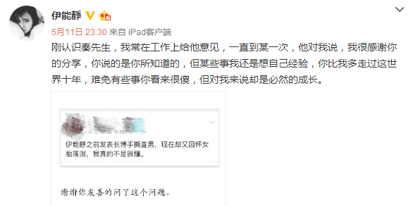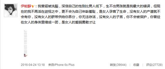 2015年6月24日,伊能静发布长微博回击微博大V“衣锦夜行的燕公子”,文中有几句话说得让不少网友拍手叫好: