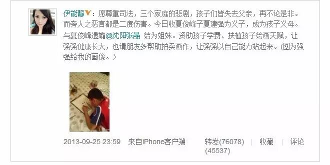 1969年出生于台湾台北,伊能静的童年因为身世的漂泊吃过不少苦,所以她太懂得了从小孤苦无依的感受,所以当2013年商贩刺死城管事件爆发舆论关注后,伊能静在微博上宣布收夏建强为义子,资助孩子的学费,培养孩子的绘画天赋。