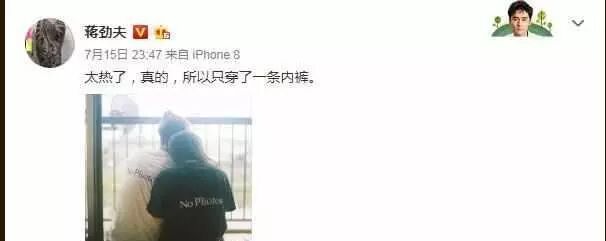 7.15日蒋劲夫发布了一张和女友一起的背影图吗,两人身穿情侣衫,相互依偎在一起,画面很是甜蜜,虽然当时没有爆出女友有的正面照,但是蒋劲夫也确实被恋爱的光环给笼罩了。