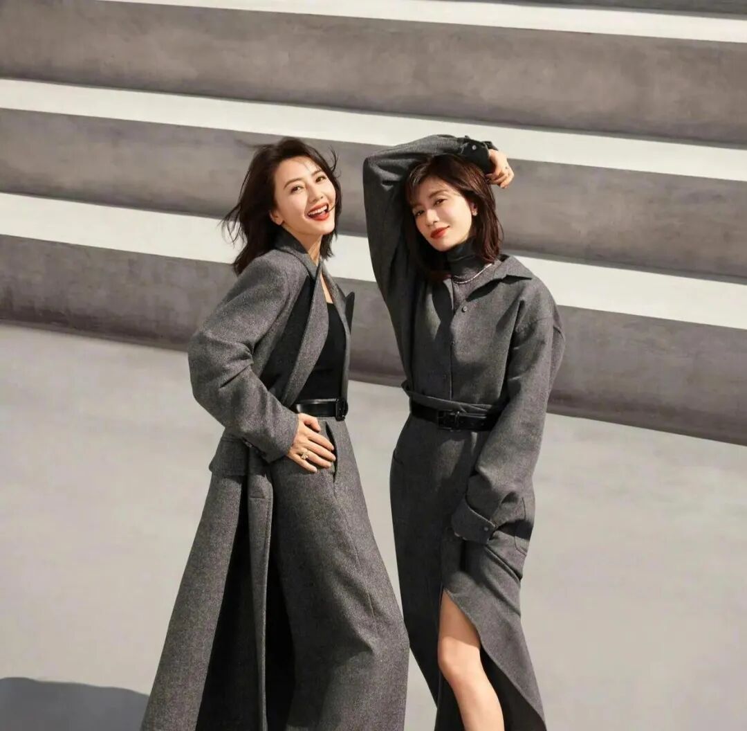 高圆圆解开大衣纽扣,露出纤细腰线,内搭的黑色绸缎吊带裙流淌着慵懒风情;贾静雯将大衣严谨扣至领口,千鸟格纹铅笔裙勾勒出职场女强人的利落。一个温柔如水,一个干练坚韧,却在镜头前呈现出完美的和谐。
