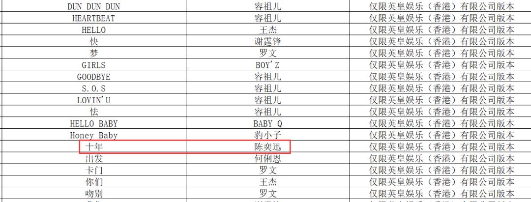 如丰华唱片股份有限公司版本的蔡琴《恰似你的温柔》,英皇娱乐(香港)有限公司版本的陈奕迅《K歌之王》《十年》《LONELY CHRISTMAS》《天下无双》《明年今日》,容祖儿《抱抱》《逃避你》《全身暑假》,爱贝克思股份有限公司版本的信乐团《死了都要爱》《离歌》《海阔天空》;除了港台歌手,广东地区具有知名度的毛宁、杨钰莹等歌手作品,如广州新时代影音公司版本的《一片艳阳天》《晚秋》《弯弯的月亮》等,也在“下架”之列。