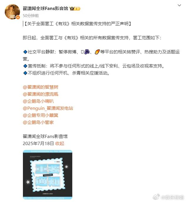吴宣仪和翟潇闻主演的新剧《有戏》于2025年7月18日正式官宣,引发翟潇闻后援会的抵制。