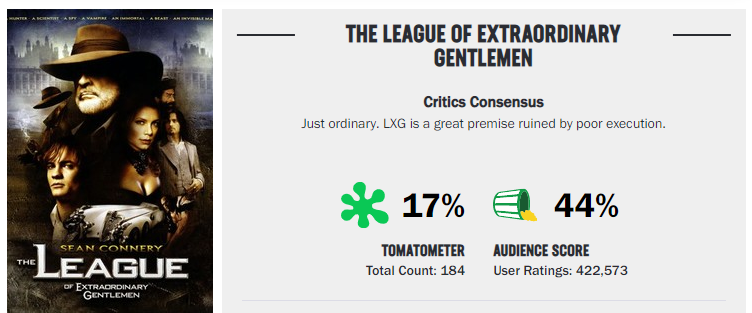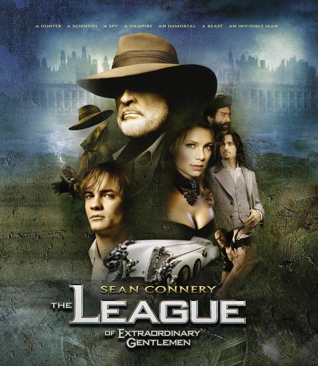 这些作品大家都很熟悉了,随着肖恩康纳利的去世,相信最近一段时间上述作品会被不断提及,但有一部作品,比较特殊,或许你看过,但提取该片的不算很多。那就是肖恩·康纳利最后一部电影作品——《天降奇兵》(The League of Extraordinary Gentlemen)。 之所以特殊,不单单是由于该片是老爷子最后的作品,还因为电影在另一层面不算光彩的事情:某种意义上,是因为这部电影才导致肖恩·康纳利退隐江湖,不再制作电影的。 这部拍摄于2003年的电影,成本7800万,最终北美票房6600万,全球累计票房也只有1.79亿,位列全年第28位。与同期的《加勒比海盗》的全球6.5亿不可同日而语。