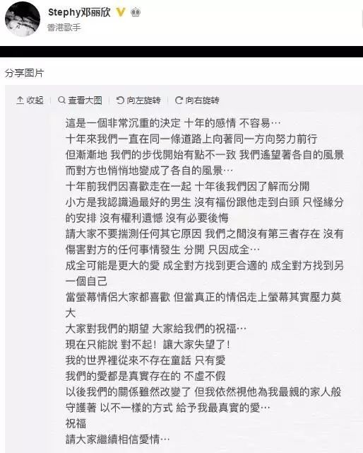 邓丽欣在微博上发布长文回应分手,否认两人之间有第三者存在,并称两人当初因为喜欢走在一起,如今因了解而分开。