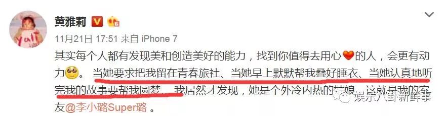 最后要说的这一位可能很多人不知道,因为她藏得太深了。很多人觉得娱乐圈女生之间的明争暗斗更犀利,因为女生比较敏感,也比较有心思。但这也只是一部分,因为李小璐就不是,李小璐最近上《青春旅社》,就帮了黄雅莉很大的忙,黄雅莉原本只是来《青春旅社》客串的,住一两天就走的那种,但是李小璐认识了黄雅莉之后发现她是一个人品好又有才华的女生,于是跟节目组要求把黄雅莉留下来当固定嘉宾,这样黄雅莉就有了更多表现的机会。令人佩服的是,这些事情李小璐没跟大家说,节目组也没有强调,是黄雅莉自己在微博上说了大家才知道的,她能作为固定嘉宾留在节目组,都是因为李小璐的要求。