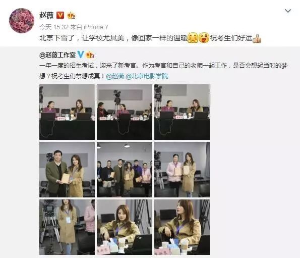 2月21日,赵薇现身母校北京电影学院,与大学班主任崔新琴老师一起,为参加考试的学生评分。下午,赵薇还在转发的微博上写道:北京下雪了,让学校尤其美,像回家一样的温暖……并祝考生们好运。