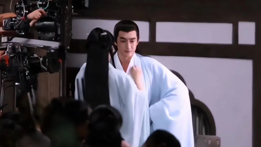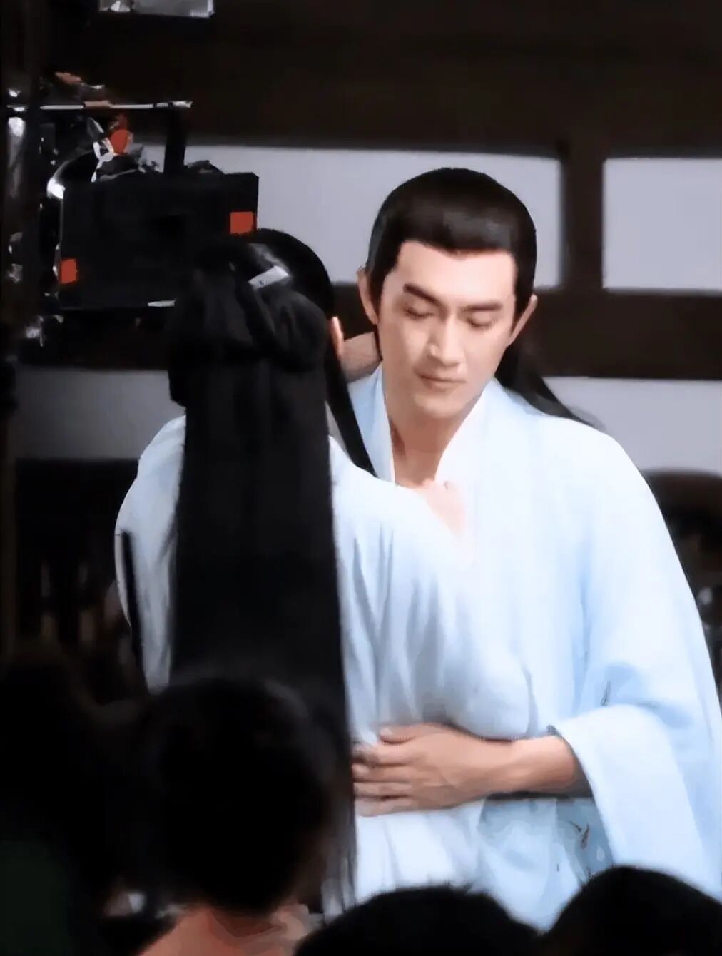 画面中,两人身穿同色系全白戏服,长发与古装扮相造型惹眼,一旁的摄像机正在拍摄,投入到演戏中的二人紧紧相贴,林更新单手搂住对方腰部,女方则贴心地为其整理头发,动作亲密画面唯美。