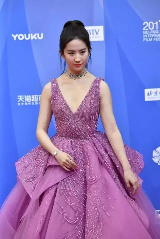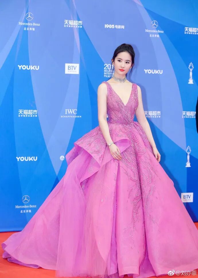 出席北京电影节的时候,这套礼服夸张的裙摆把她的上半身显得略微粗壮了,腰线也没有掐得很好,突出了她的腹部,年龄感也一下出来了。