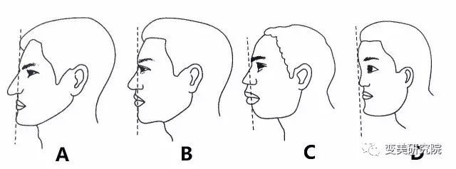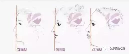 但这个图比较不标准,因此有一种说法是通过眉心位置做出垂直线,判断鼻下点(鼻中膈与上唇皮肤所构成的角的最深点)位置与这条直线的前后关系,上述面型分别为直面型,微凸面型,凸面型,凹面型。