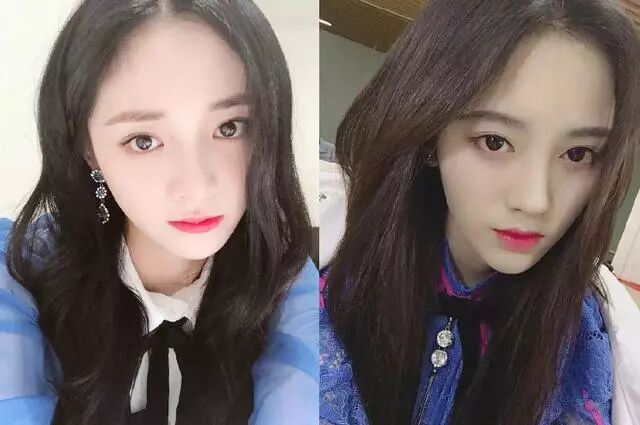 不过,坛子觉得还是后面两位——周洁琼和鞠婧祎更相像一点,吴宣仪和这两位可能也就是撞了个妆。但是这后两位啊,你看这眼睛的形状,鼻子的精致成都,加上这嘴唇上翘的弧度,相似度几乎是99%。你看,她们居然还系上了几乎一样的小丝带!
