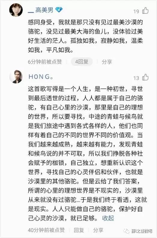 这首歌所表达的感情是如此复杂,骆驼与沙漠,寓意着孤独还是希望?大概只有单曲循环无数次的铁粉们才会有这样深切的感悟!