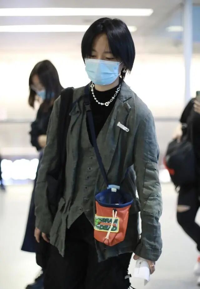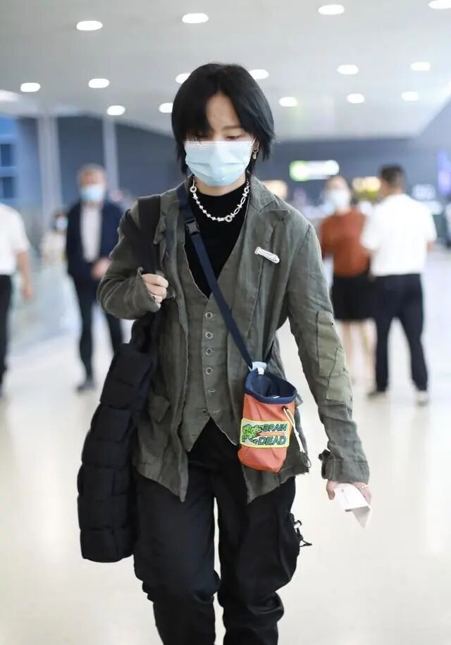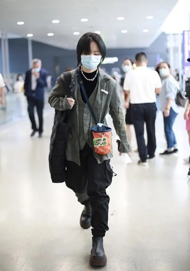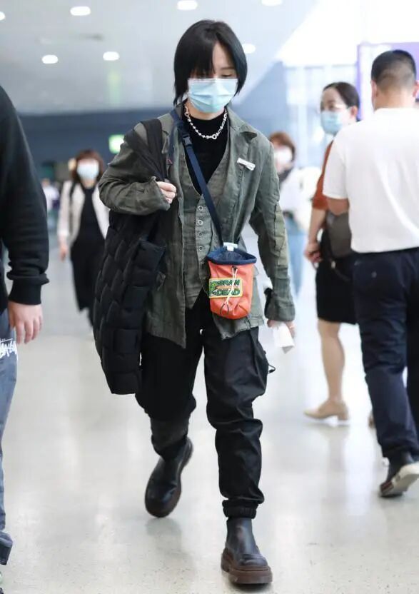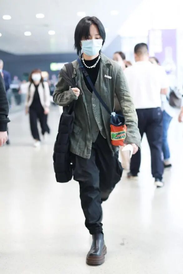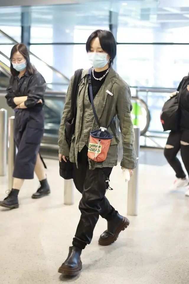周笔畅的整个造型偏中性风,皱巴巴还有补丁的军绿色西装和马甲背心看起来非常个性又随意,凸显她的颓废气质。一双厚底皮靴为造型带来更多设计感,可甜可酷,还有增高拉腿长的效果,搭配工装裤时尚又前卫,小个子也能穿得酷飒十足。黑色的束脚裤扎进厚底皮靴又酷又飒,英气硬朗,看起来走路带风。