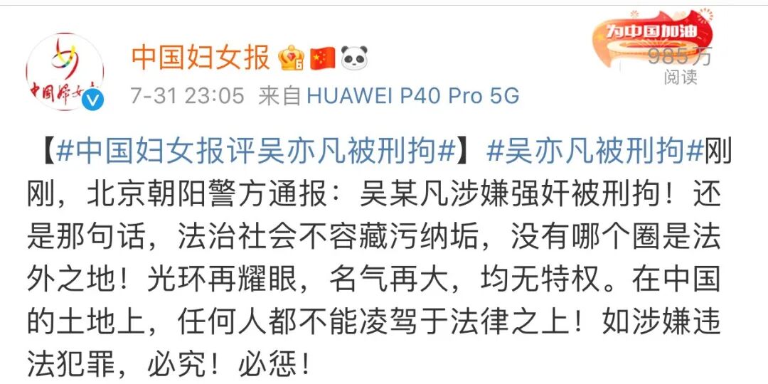中国妇女报:还是那句话,法治社会不容藏污纳垢,没有哪个圈是法外之地!光环再耀眼,名气再大,均无特权。在中国的土地上,任何人都不能凌驾于法律之上!如涉嫌违法犯罪,必究!必惩!