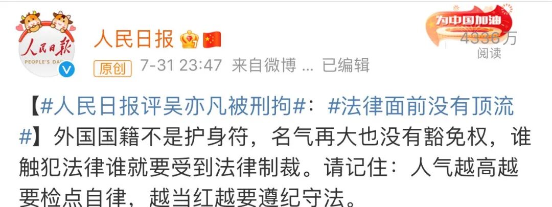 人民日报:法律面前没有顶流,外国国籍不是护身符,名气再大也没有豁免权,谁触犯法律谁就要受到法律制裁。请记住:人气越高越要检点自律,越当红越要遵纪守法。