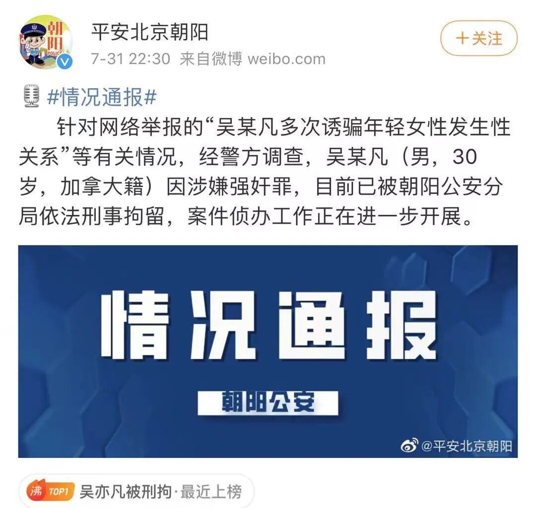 7月31日晚间, “平安北京朝阳”微博号发布情况通报:针对网络举报的“吴某凡多次诱骗年轻女性发生性关系”等有关情况,经警方调查,吴某凡(男,30岁,加拿大籍)因涉嫌强奸罪,目前已被朝阳公安分局依法刑事拘留,案件侦办工作正在进一步开展。