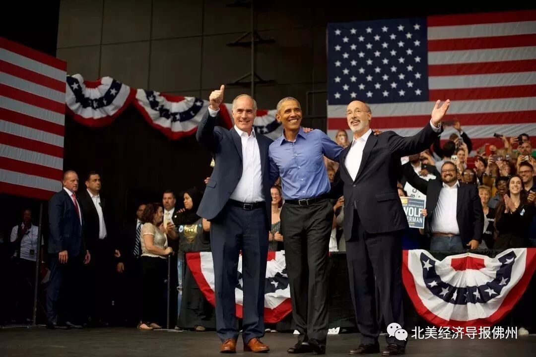 现任宾夕法尼亚州州长沃尔夫(右)在2014年逆流而上击败共和党州长成功当选后,一直保持着稳定的支持率。虽然沃尔夫并没有受欢迎到让人难以击败,但很难找出他会输掉连任选举的理由。图为前美国总统奥巴马为沃尔夫的选举造势站台。摄:Mark Makela/Getty Images