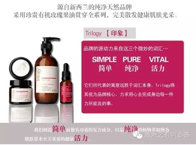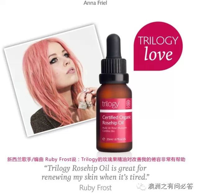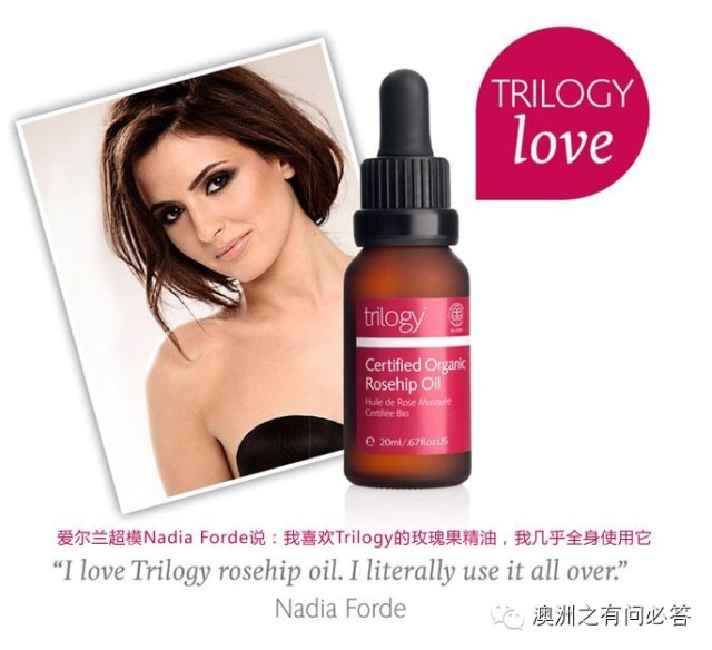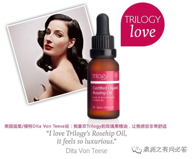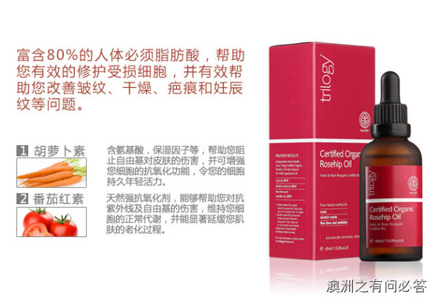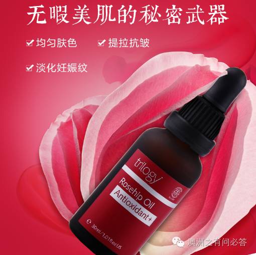 Trilogy有机玫瑰果油是100%有机野玫瑰果油具有强化组织功效,容易渗透到真皮层,适合任何肤质,特别适合缺水、晒伤、出现斑点、成熟以及老化肌肤,对淡化色斑、重现均匀色调和增加肌肤弹性有很好作用,包括像淡化/消除疤痕,皱纹、妊娠纹、肥胖纹、干纹、痘印等。
