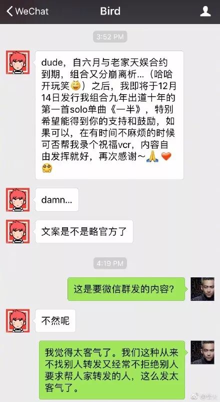 当时张远为了宣传新歌,邀请苏醒帮自己修改群发文案,被苏醒指出“太客气”,要更直接一点▼▼▼