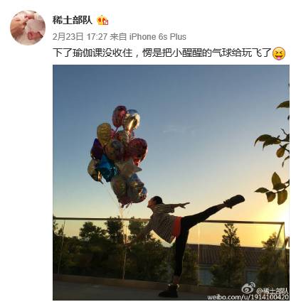 章子怡产后在微博晒照,辣妈踢腿秀舞技,身材纤瘦宛若少女。并写道“下了瑜伽课没收住,愣是把小醒醒的气球给玩飞了”。