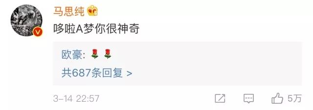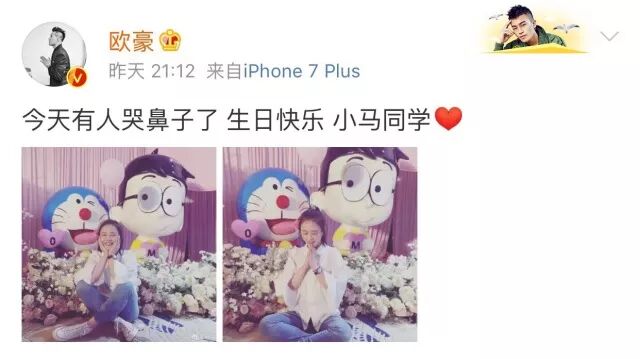 值得关注的是,马思纯身后的“哆啦A梦”和“大熊”手中的心型气球上赫然印着欧豪和马思纯的名字首字母“O”和“M”。女主马思纯随后还在下方评论区中留言:“哆啦A梦你很神奇。”