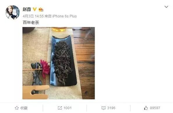而近日,小燕子赵薇更是在微博晒出了“百年老茶”的茶汤与茶叶。将近一万的点赞以及几千评论与转发使“老茶”这个话题产生的涟漪越泛越开了。如今的老茶是火到连明星都来关注了。