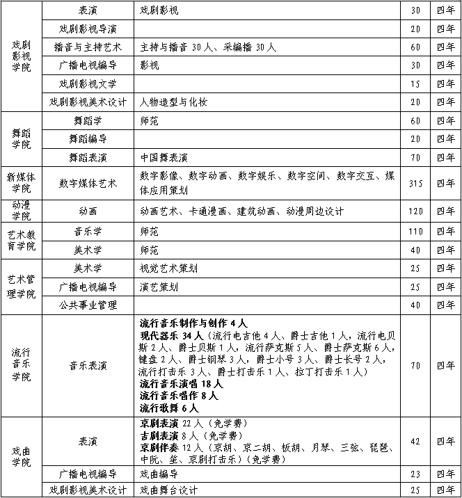 6、戏剧影视导演、音乐学(含师范)、作曲与作曲技术理论、艺术与科技(电子音乐制作与创作)、音乐表演(民族乐器/西洋管弦/声乐/钢琴/合唱指挥/流行音乐制作与创作/现代器乐/流行音乐演唱/流行音乐唱作/流行歌舞)、表演(戏剧影视/服装与服饰展演/京剧表演/吉剧表演/京剧伴奏)、舞蹈学(师范)、舞蹈编导、舞蹈表演(中国舞表演)专业,以专业分择优录取。