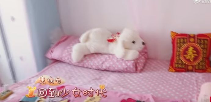 卧室装饰也走的是少女风。粉色的床单,可爱的毛绒玩具,谁能看出这是六十多岁奶奶的房间?
