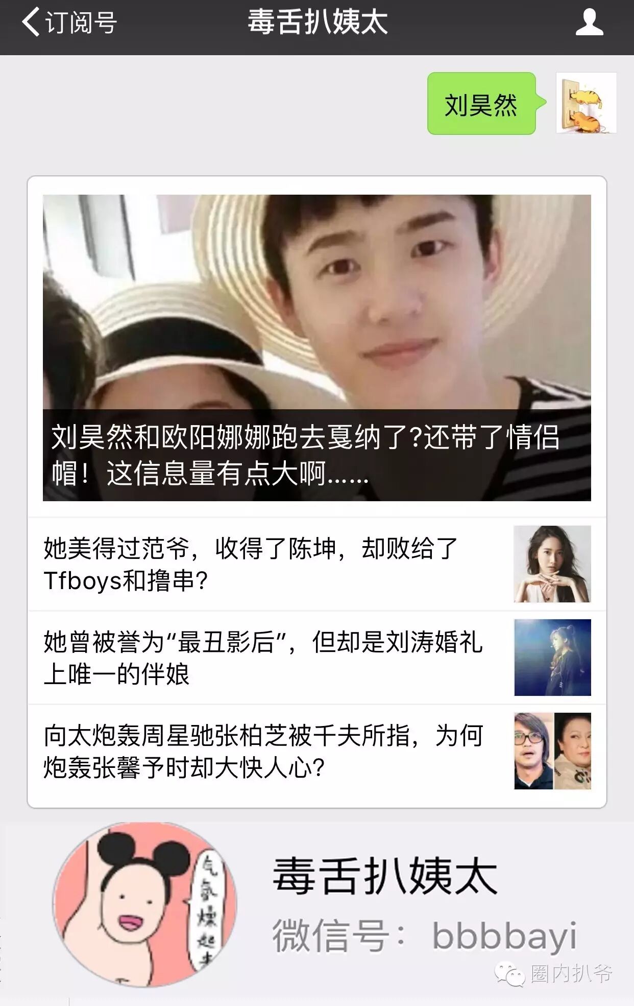 看扒爷一个人讲八卦腻不?来关注扒爷CP,毒舌扒姨太吧!一手明星猛料,时尚小公举,最浪毒舌妇就是她! 关注后回复关键词:【刘昊然】 就有猛料哦!