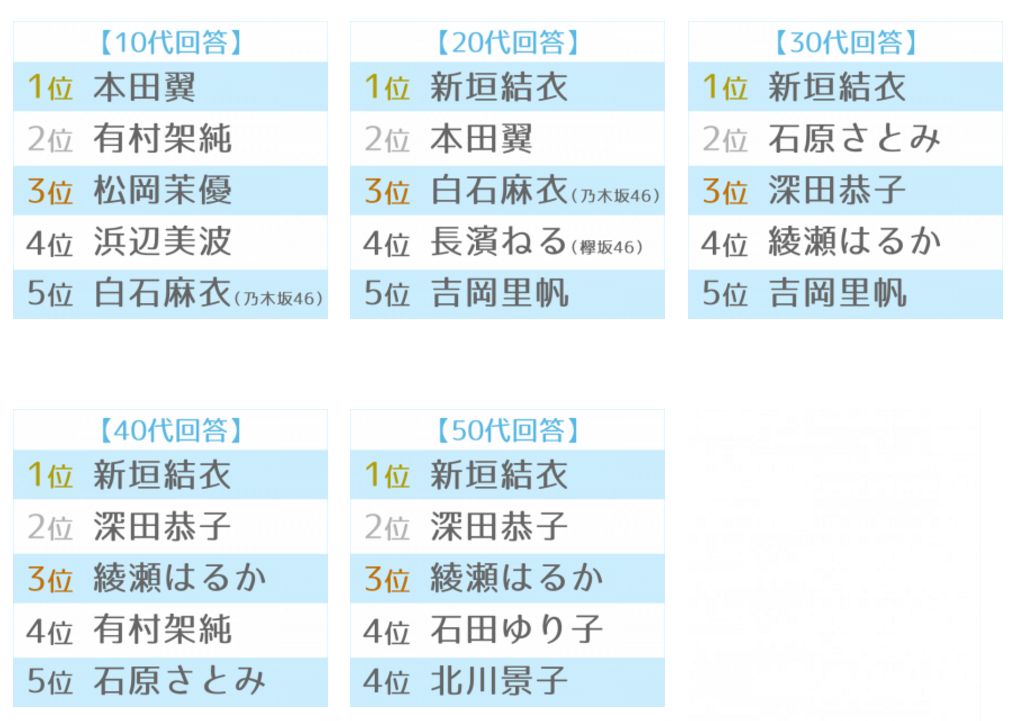 也许绫濑遥在中国不是最有人气的日本女演员,但不可否认她在日本的国民度,目前12届榜单中,她全部上榜,其中五次拿到冠军,从少女演到了继母,依然受到欢迎,投票者称:“绫濑遥性格开朗,感觉和她在一起会元气十足。”、“她天真可爱,只是看着她就开心。”